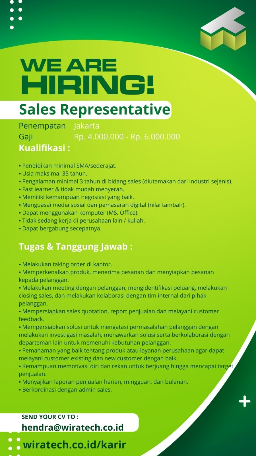 WIRATECH memberikan kesempatan Ber’karir, bagi siapa saja yang mempunyai kemampuan dan passion di bidang dan Posisi yang kami tawarkan.
