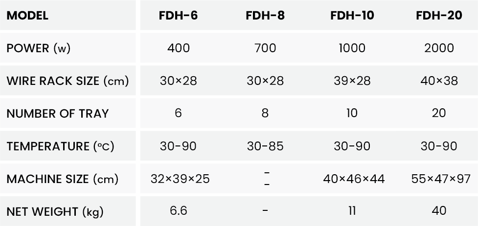 Food Dehydrator 8 Tray FDH-8 ialah salah satu tipe Food Dehydrator merupakan alat yang digunakan untuk mengeringkan bahan makanan hingga susut dan menjadi makanan kering. Hasil bahan makanannya bisa di bilang mirip seperti keripik yang dibuat menggunakan vacuum frying.