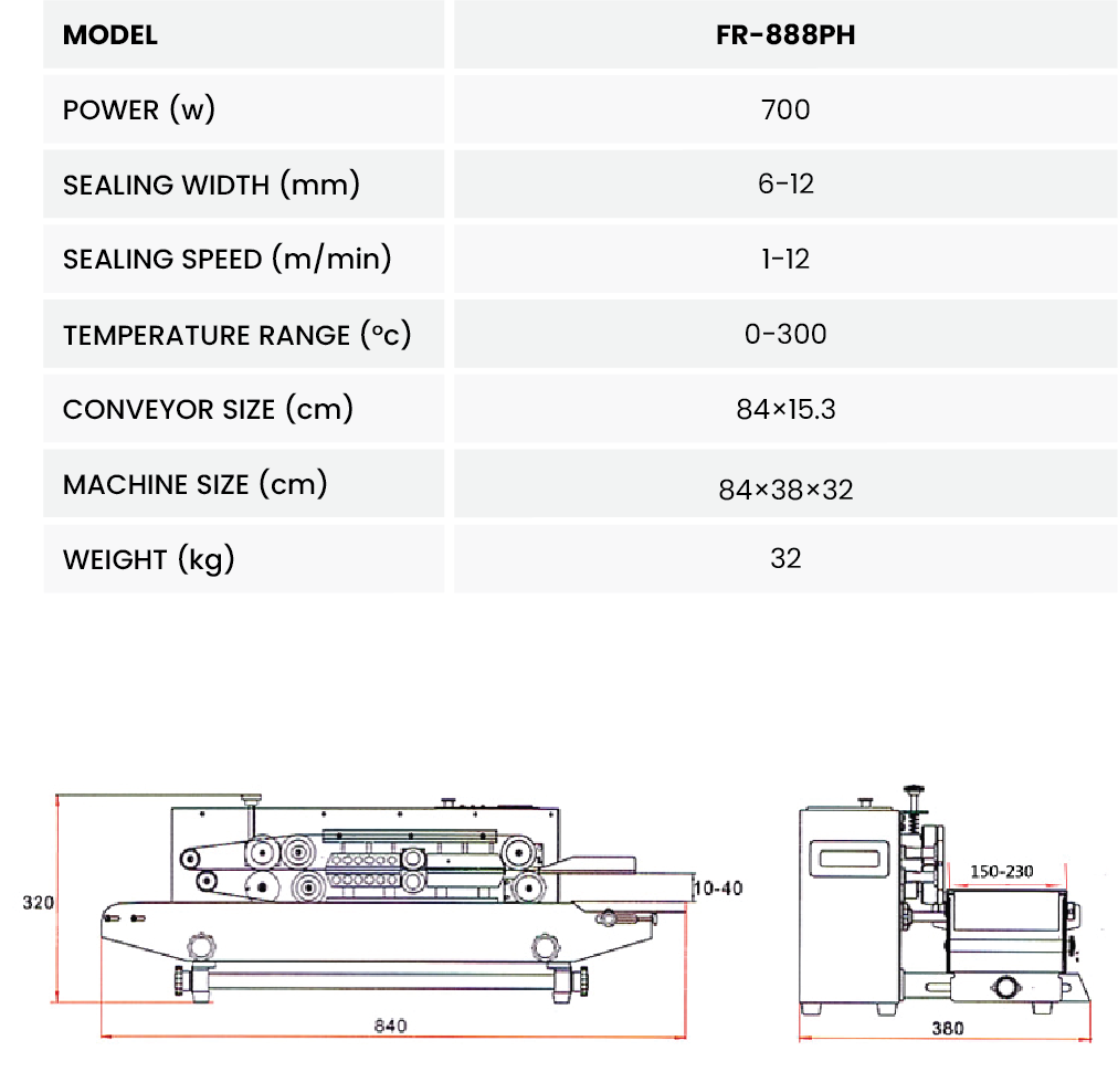 FR-888PH merupakan salah satu jenis mesin continuous sealer mode Horizontal/Mendatar termurah di Wiratech. Mesin ini memang sengaja di buat untuk memenuhi para pebisnis pemula yang mempunyai buget terbatas namun menginginkan mesin kemasan sealer yang berkualitas.FR-888PH hadir dengan balutan warna abu-abu berfinishing Glosy, dari sisi material mesin ini di buat menggunakan material Iron/Metal. Sehingga konstruksinya cukup kuat dan solid dan mampu bekerja mengemas ukuran besar sekalipun