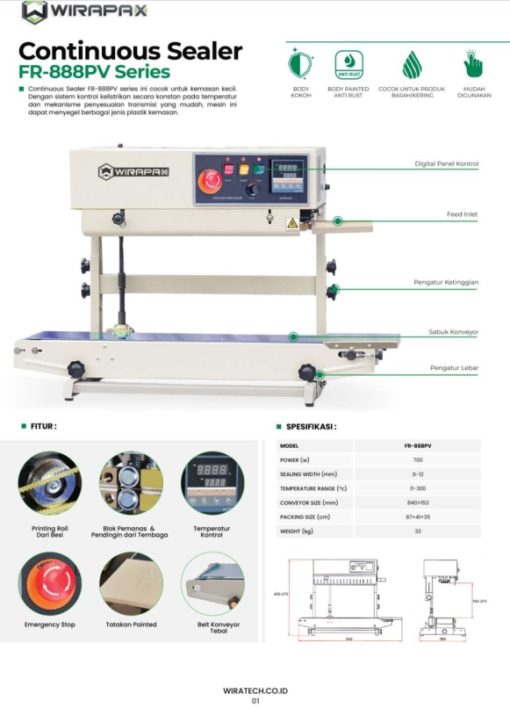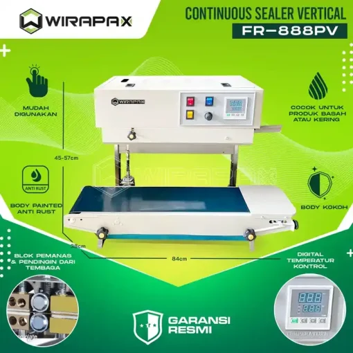 FR-888PV merupakan salah satu jenis mesin continuous sealer mode Vertikal/Berdiri termurah di Wiratech. Mesin ini memang sengaja di buat untuk memenuhi para pebisnis pemula yang mempunyai buget terbatas namun menginginkan mesin kemasan sealer yang berkualitas.FR-888PV hadir dengan balutan warna abu-abu berfinishing Glosy, dari sisi material mesin ini di buat menggunakan material Iron/Metal. Sehingga konstruksinya cukup kuat dan solid dan mampu bekerja mengemas ukuran besar sekalipun