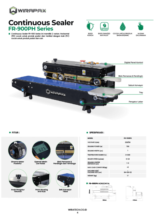FR900 PH merupakan salah satu jenis mesin continuous sealer termurah di Wiratech. Mesin ini memang sengaja di buat untuk memenuhi para pebisnis pemula yang mempunyai buget terbatas namun menginginkan mesin kemasan sealer yang berkualitas.FR900PH hadir dengan balutan warna hitam berfinishing Glosy, dari sisi material mesin ini di buat menggunakan material Iron/Metal. Sehingga konstruksinya cukup kuat dan solid dan mampu bekerja mengemas ukuran besar sekalipun