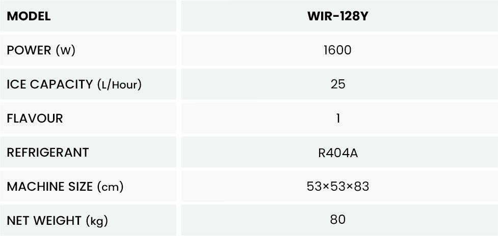 Mesin Hard Ice Cream Machine WIR-128Y, ini merupakan mesin pembuat es krim untuk tipe Hard Ice Cream. Hard Ice cream sendiri seringkali di gunakan dalam pembuatan menu es krim dengan tekstur lebih padat, seperti Gelato,Sorbet,dll. Mesin Hard ice Cream ini mempunyai power output hingga 2000 Watt yang sanggup mengolah 1 flavor / rasa sebanyak 25 liter/jam.
