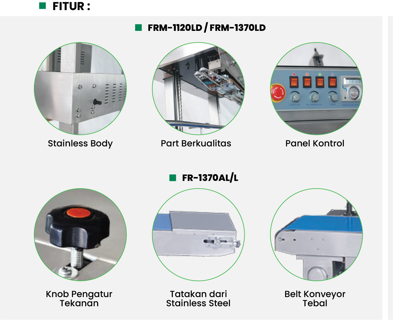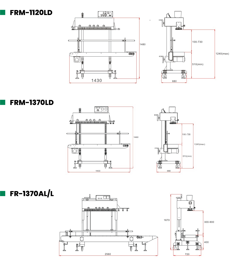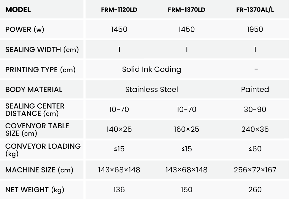 Heavy Duty Continuous Sealer FRM-1370LD bergaransi resmi 1 tahun dengan harga termurah dan sparepart terlengkap. Continuous Sealer Heavy Duty ini bertenaga daya listrik sebesar 1450 watt. Memiliki jarak dari sealing centerto conveyor table 100-700 mm dan hasil sealer selebar 10 mm serta mampu menahan beban hingga 15 kg. Hubungi Team marketing kami sekarang juga.