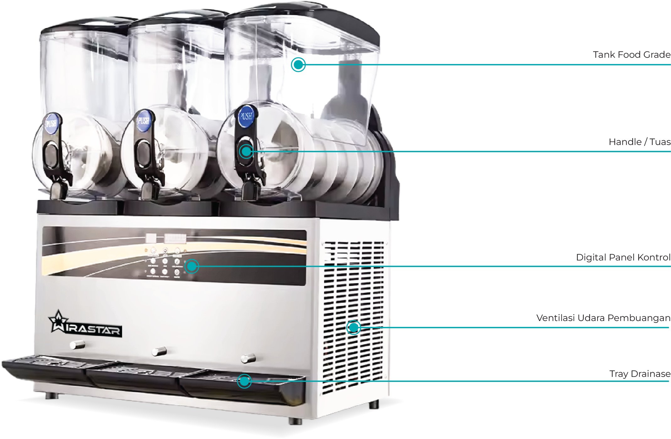 Ice Slush merupakan salah satu mesin canggih yang dapat menghasilkan varian minuman Slurpee atau Ice Smoothies. Mesin ini mempunyai varian mulai dari 1 hingga paling besar 3 tank. Kapasitasnya mesin ini cukup besar sehingga sangat cocok digunakan untuk bisnis minuman kekinian. Mesin ice Slush Wirastar sudah di tanamkan beberapa komponen elektronik terbaru dengan seabrek fitur yang sangat canggih.
