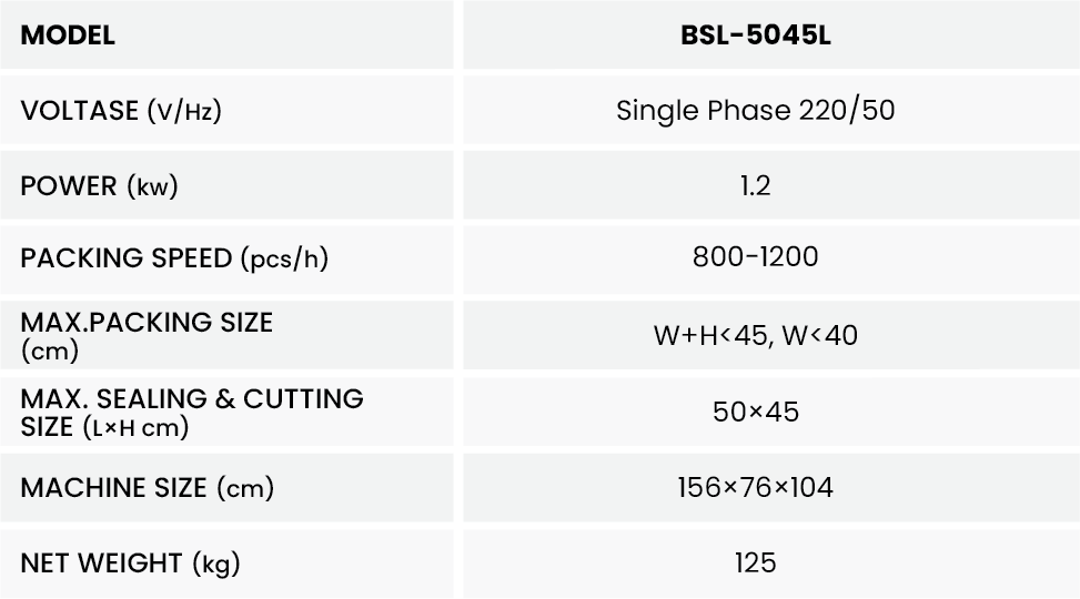 L Seal Cutting Machine BSL-5045L bergaransi resmi dengan harga termurah dan sparepart terlengkap.L Seal Cutting Machine BSL-5045L ini bertenaga daya listrik 1,2 kW. Serta Packing Speed 800-1200 pcs/h dan Max. Packing Size (L×W×H) 450×400×300 mm. Juga memiliki bobot mesin 125-135 kg. Segera hubungi kami untuk jenis & tipe mesin yang anda cari.
