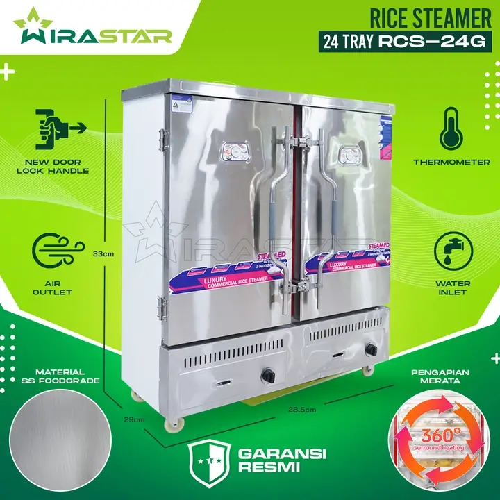 Rice Steamer 24 Trays / RCS-24X berfungsi untuk memasak nasi dengan kapasitas besar. Mesin ini juga menjadi prioritas dalam menghidangkan makanan lebih cepat. Rice Steamer memiliki garansi resmi dengan harga termurah dan sparepart terlengkap. Rice Steamer ini memiliki kemampua memasak nasi hanya dalam waktu 45 menit, di dukung dengan kapasias Tray: 24 Trays. Segera hubungi kami untuk jenis & tipe mesin yang anda cari.