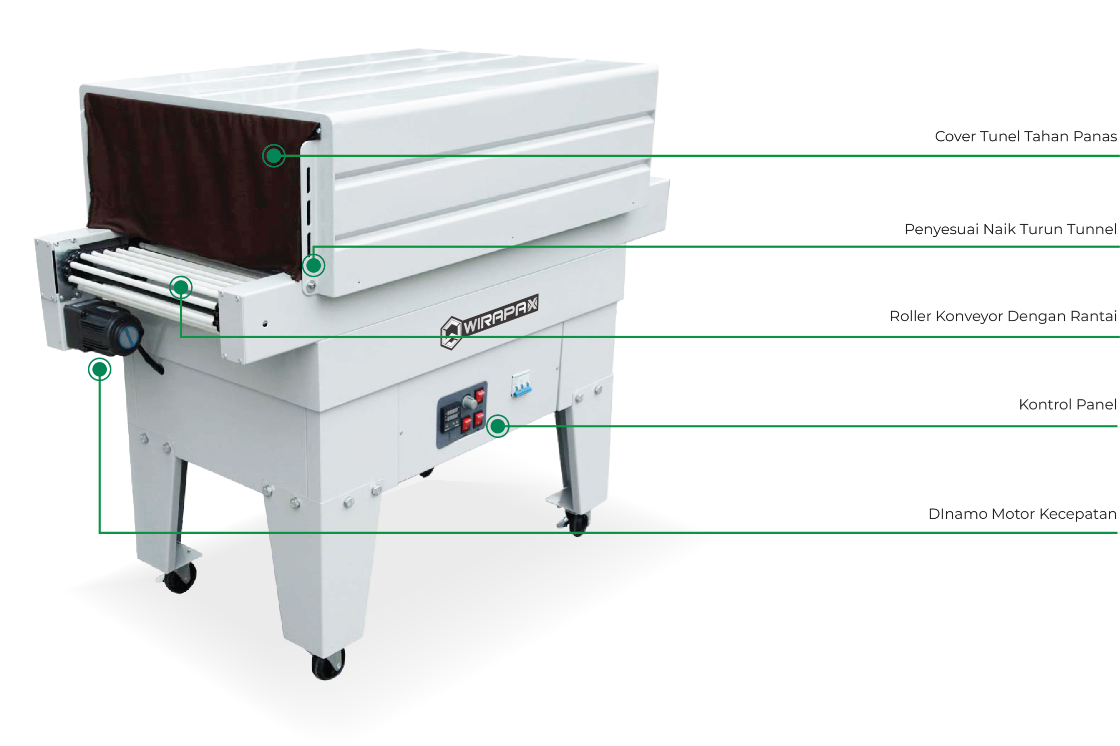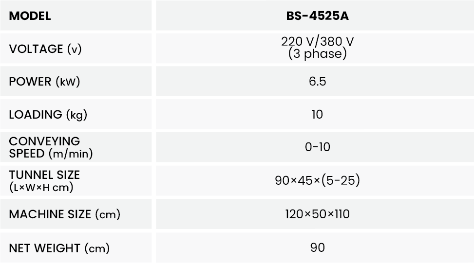 Mesin Shrink Tunnel BS-4525A merupakan mesin kemasan yang bisa menyusutkan bagian luar plastik kemasan agar melindungi sempurna bagian luar pada produk. Mesin ini mempunyai beberapa keunggulan seperti Tinggi tunnel yang dapat diatur secara manual dengan Sistem penggunaan yang sederhana. Mesin ini juga di desain menggunakan Konstruksi rangka besi yang menjamin durabilitas maksimal serta lebih kokoh. Mesin ini mempunyai fitur Pengatur kecepatan konveyor digital dengan Kecepatan Conveyor 0-10 m / min. Kontrol suhu udara 0 ° hingga 200 ° C. dengan berbagai Pilihan jenis conveyor Mesh atau Roller.