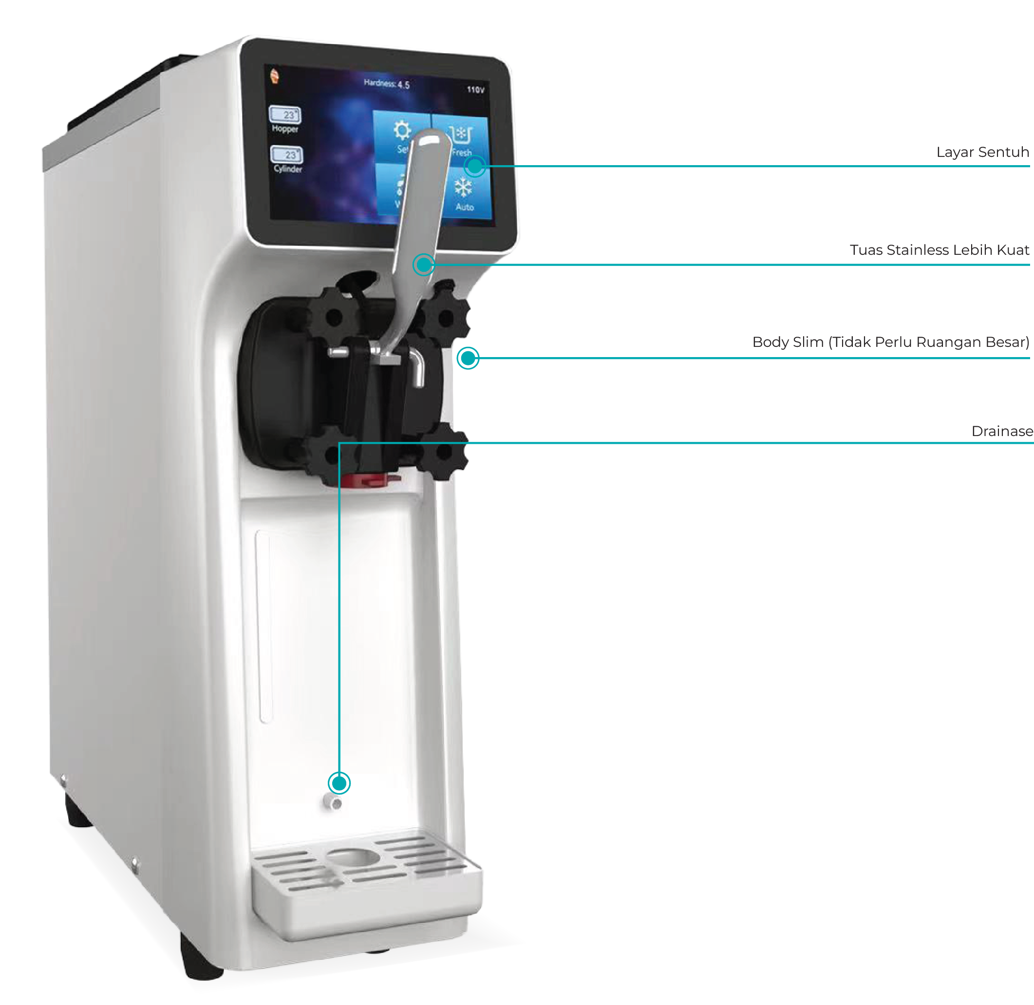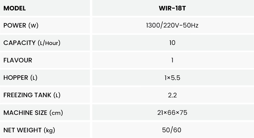 Mesin ice Cream Maker WIR18T – 1 Tuas Table Type merupakan salah satu tipe mesin es krim 1 Tuas tipe meja yang paling laris saat ini. Mesin ini mempunyai power output sebesar 1300 Watt pada tegangan 220V, sehingga masih sangat ramah di gunakan utk kebutuhan rumahan serta cafe sederhana. dengan temperatur maksimum mencapai -25 derajat celcius. Mempunyai tampilan dengan pengoperasian mode display Touch Screen dengan dimensi kompak design menarik